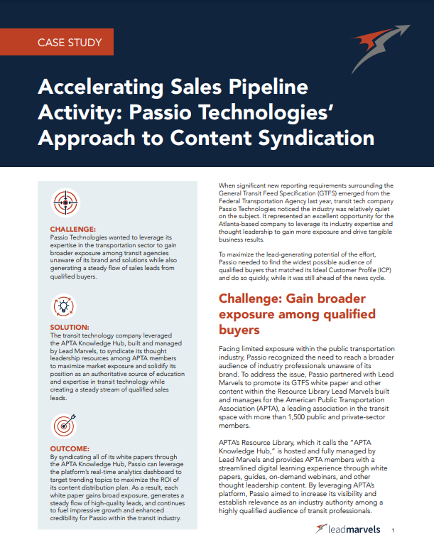 Accelerating Sales Pipeline Activity: Passio Technologies’ Approach to Content SyndicationLearn how Passio Technologies capitalized on an important transit industry development to showcase its thought leadership, educate transportation association members, and ultimately benefit through hundreds of high-quality converted leads.